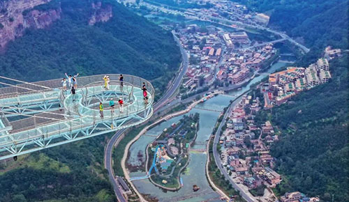 太行大峡谷玻璃桥 太行大峡谷玻璃桥,位于太行天路景点,桥面长280米、宽2.5米、桥面距谷底相对高度260米,桥面采用全透明玻璃铺设。玻璃桥选用新型复合材料建造,桥面采用先进的9D音频技术。站在桥上除了居高临下欣赏太行大峡谷的壮阔风景,一览峡谷的心旷神怡之外,更能体验透空踩踏的刺激与惊奇。
