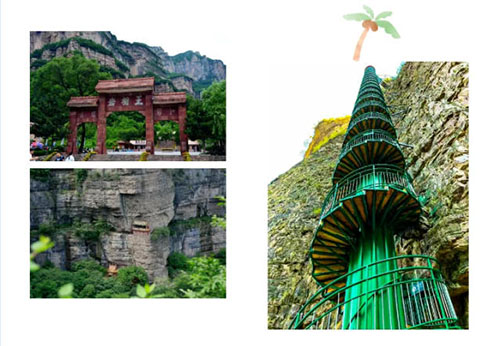 摩天筒梯 亚洲最高的摩天筒梯位于王相岩景区内,是一个呈螺旋状扶摇直上的钢结构筒梯,梯高88米,直径3米,台阶有331步,螺丝一般直插云霄。有着“华夏第一筒梯”之称!登梯而上,360°回旋攀登,即使扶栏拍摄两侧景物,亦难免头晕目眩,摇摇欲坠如临深渊。道路险峻,或挂万丈悬崖,或嵌陡峭绝壁。