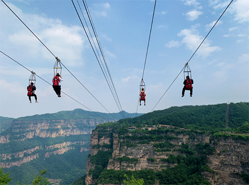 心跳、刺激、惊心动魄,300米高空俯瞰谷中美景,像鸟儿一样展翅凌空听着风呼啸而过。太行大峡谷高空滑索由平步青云上方“飞”至羞女峰观景台,跨越峡谷长度500米,离谷底有300米落差,在体验惊险刺激的同时,可将蜿蜒曲折的景区道路以及U型天坑的美景360度尽收眼底,同时还能浏览到天路周边百花盛开的旖旎风光,最重要的是你可以放开嗓子尽情的呼喊,周围的游人只能投来羡慕嫉妒的眼光。