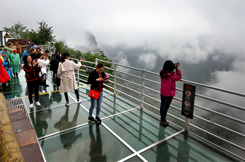 梦幻谷天空悬廊 梦幻谷天空悬廊是华中地区首座悬式挑式玻璃观景台,观景台悬挑全长59米,离地面悬空高度466米,也是亚洲悬空最高的玻璃观景台,站在台上犹如站在峡谷中间,踏足观景台上,不管是前后左右还是上下观景,都没有任何视线遮挡,浑然“峡谷凌空”一般,给人强烈的视觉冲击力,切身感觉可谓异常刺激。