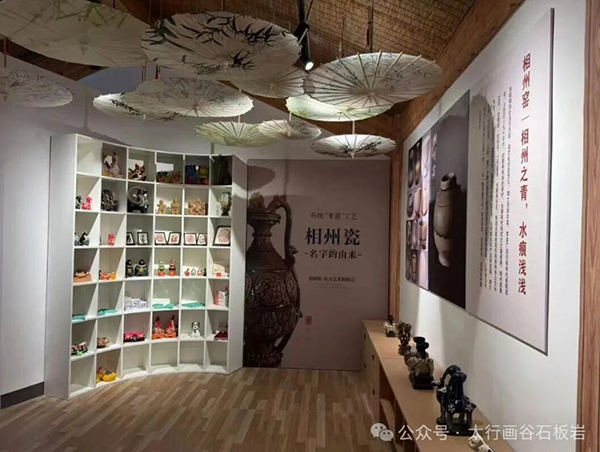 步入非遗馆,头顶悬挂的竹绘油纸伞雅致清新,瞬间将人带入充满古韵的文化氛围中。在相州瓷展区,你可以深入了解“相州之青,水痕浅浅”的相州窑历史,感受传统“非遗”工艺的魅力。