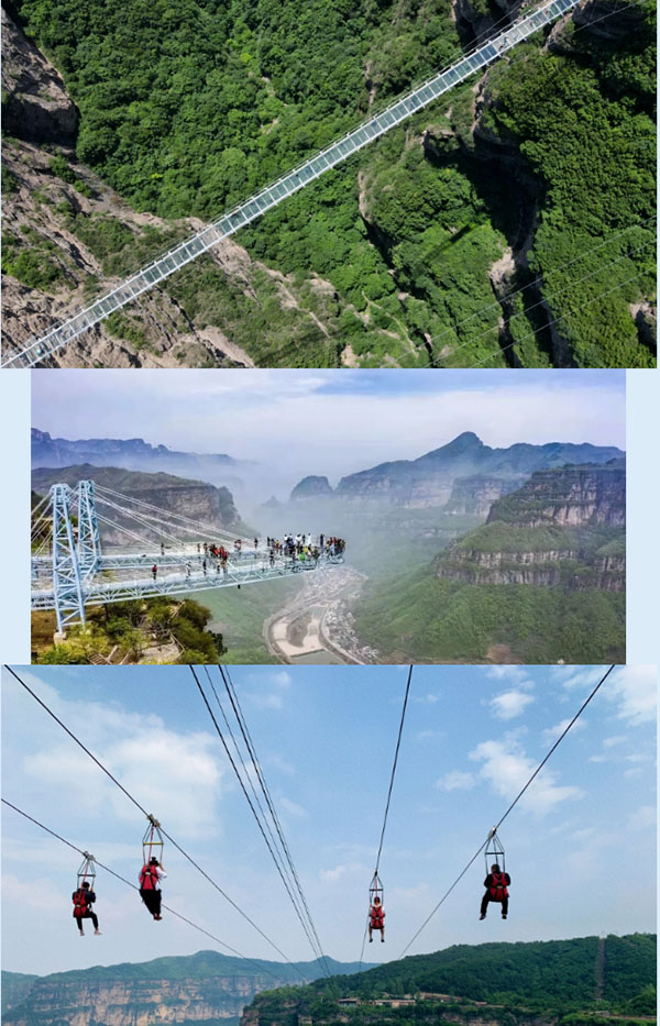 “太行天路”景区位于太行山之巅,北起桃花谷景区,南至仙霞谷景区,全长约30km,既是景区环线游览道路的重要组成部分,更是俯瞰太行山壮美风光的绝佳位置。