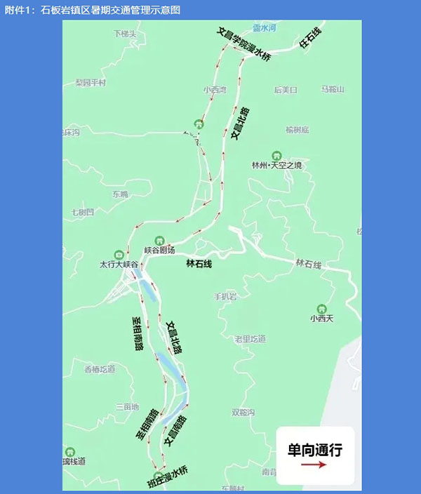 2.石板岩镇区周边道路适时实行单向循环通行。具体线路:林石、任石三岔口→文昌北路→文昌学院漫水桥东头左转→文昌学院漫水桥西头左转→052乡道→桃花谷景区→圣相南路→班庄漫水桥→文昌南路→文昌北路→林石、任石三岔口。