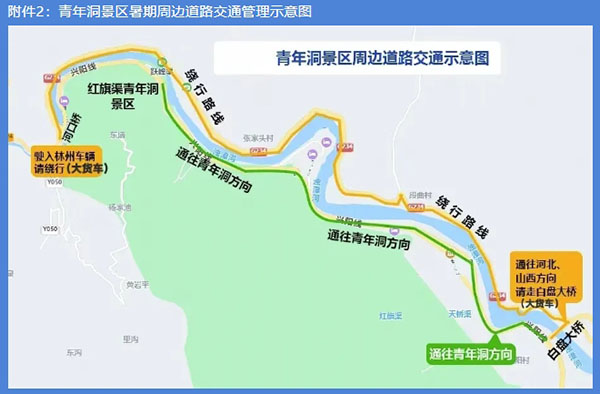 4.青年洞景区周边道路适时对通往河北、山西方向及通过河口桥进入林州方向的大货车实行禁行,过往大货车绕行白盘大桥。